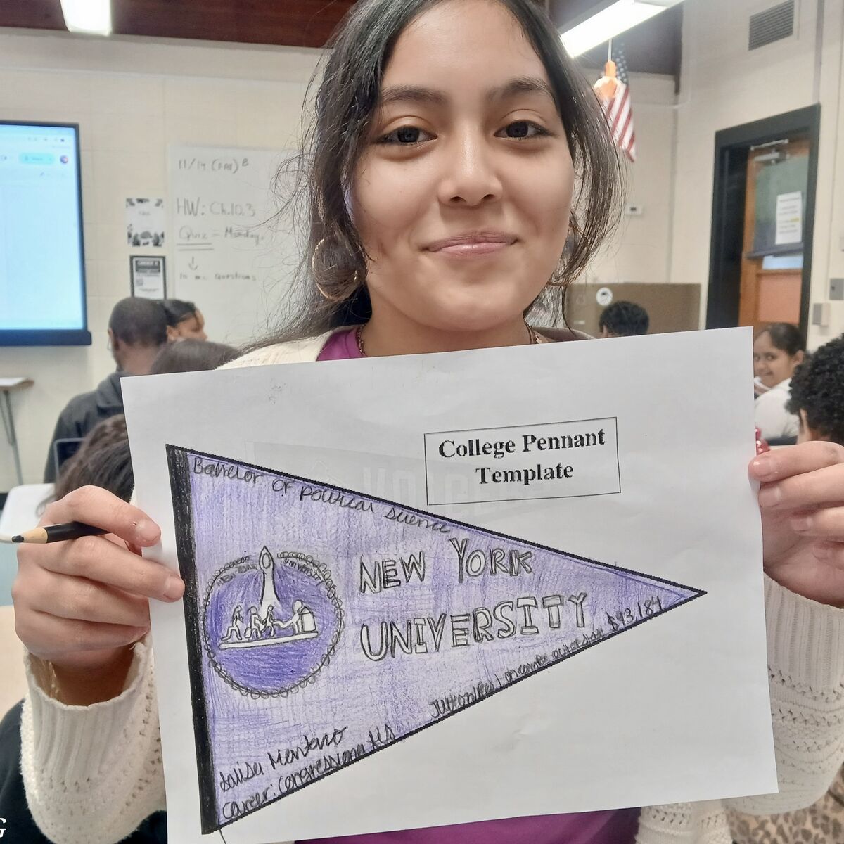 Eighth-graders in Michael Simko’s social studies classes at Schor Middle School started planning for their future by digging into the finances of attending college as part of a financial literacy lesson on savings! They researched college majors and tuition fees for various in-state and out-of-state colleges, then created a pennant with their college choice, intended major, and tuition cost.
